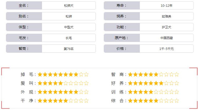 松狮犬基本资料 2025年11月24日中型犬 狗狗品种428阅读模式 松狮犬是我国本土的古老犬种,原名叫做獢獢(xiāo),因其长毛形态酷似雄狮而得名“松狮犬”。松狮犬多被用来放牧、看家,但由于毛发较长,容易杂乱,所以当做宠物圈饲养起来比较麻烦。 松狮犬英文Chow Chow,常常简称为Chow,是一种非常古老的品种,可能因其头部酷似雄狮而得名;体重约30kg,身高约50厘米;性格较温顺,可作为狩猎犬、拖曳犬、护卫犬、伴侣犬使用。 大白熊犬基本资料 博美犬基本资料 金毛犬基本资料 柴犬基本资料 点赞 https://www.xueyaer.com/gougou/981.html 复制链接 复制链接